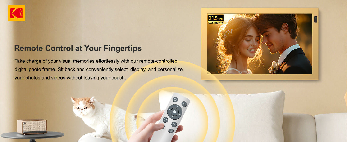 Experience timeless elegance and modern convenience with the KODAK WF215 Wi-Fi Digital Photo Frame in Matt Gold Metal Finish. Designed for those who appreciate both style and technology, this large-screen frame beautifully showcases your photos and videos in Full HD clarity while blending seamlessly into any home décor.