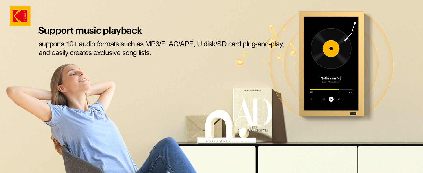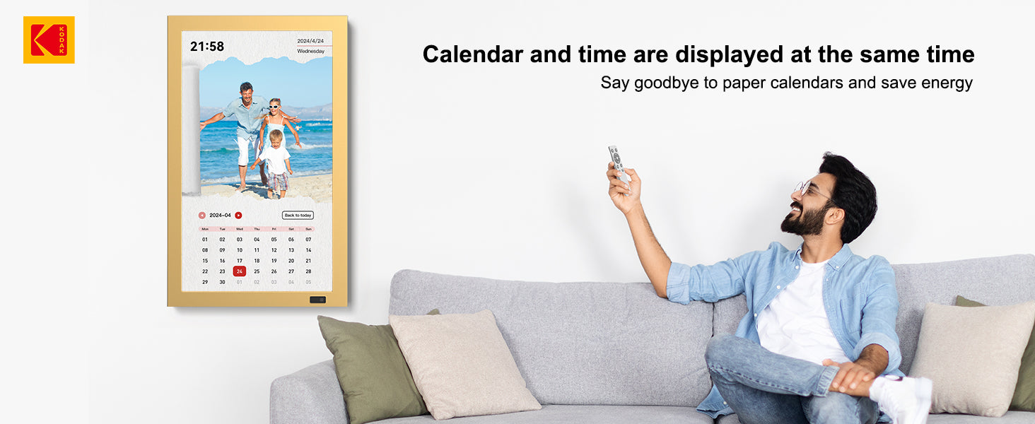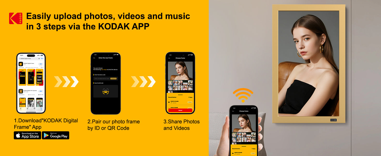 • Wi-Fi Photo & Video Sharing – Send photos and videos (with sound) instantly from anywhere using the KODAK Digital Frame app (available on iOS & Android).